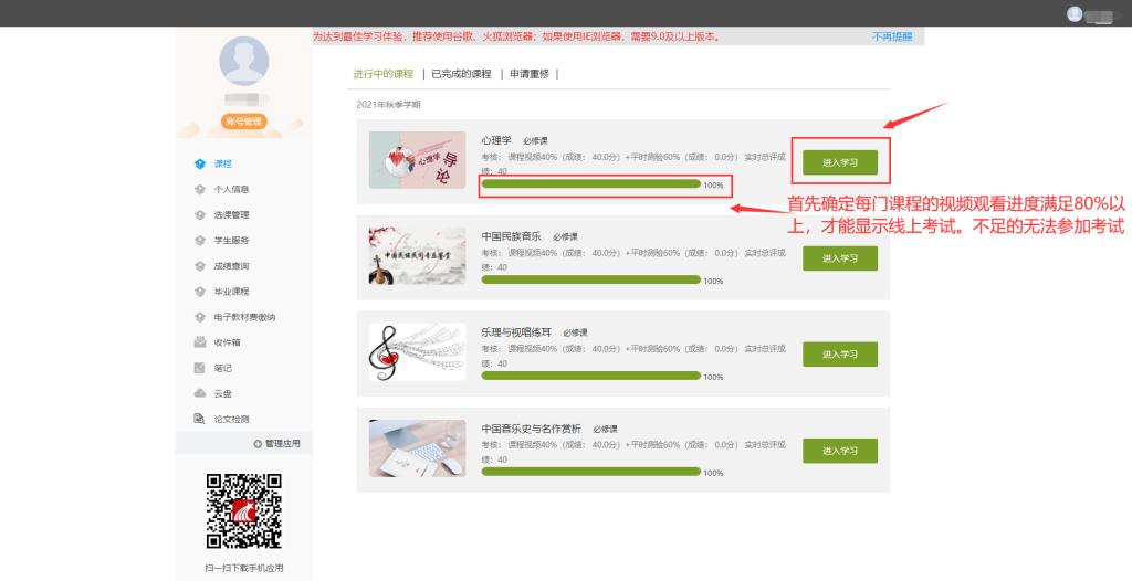 首先确定每门课程的课程观看进度满足80%以上,才能显示线上考试。课程视频不足80%的无法参加考试。