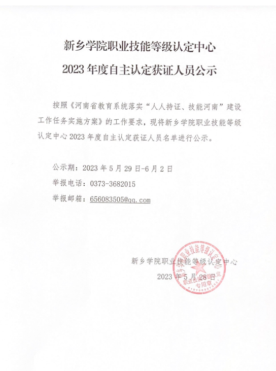 英国正版365职业技能等级认定中心2023年度自主认定获证人员公示