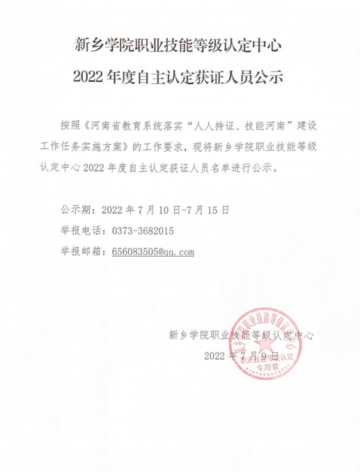 英国正版365职业技能等级认定中心2022 年度自主认定获证人员公示